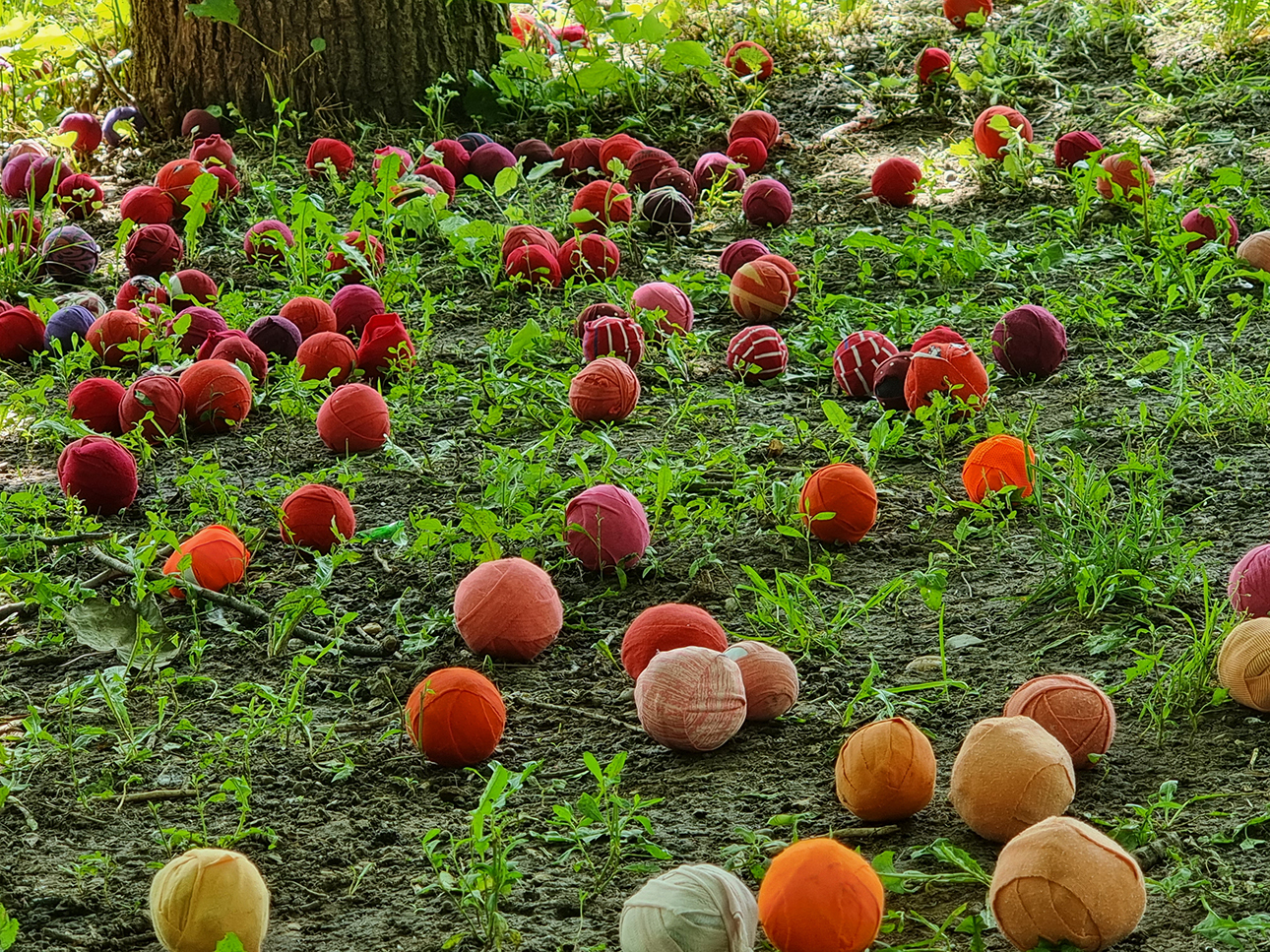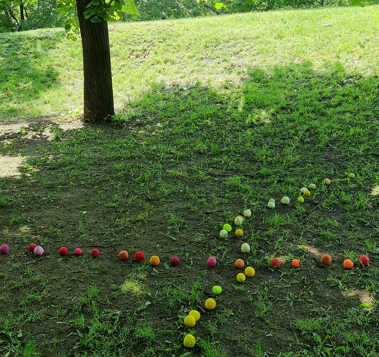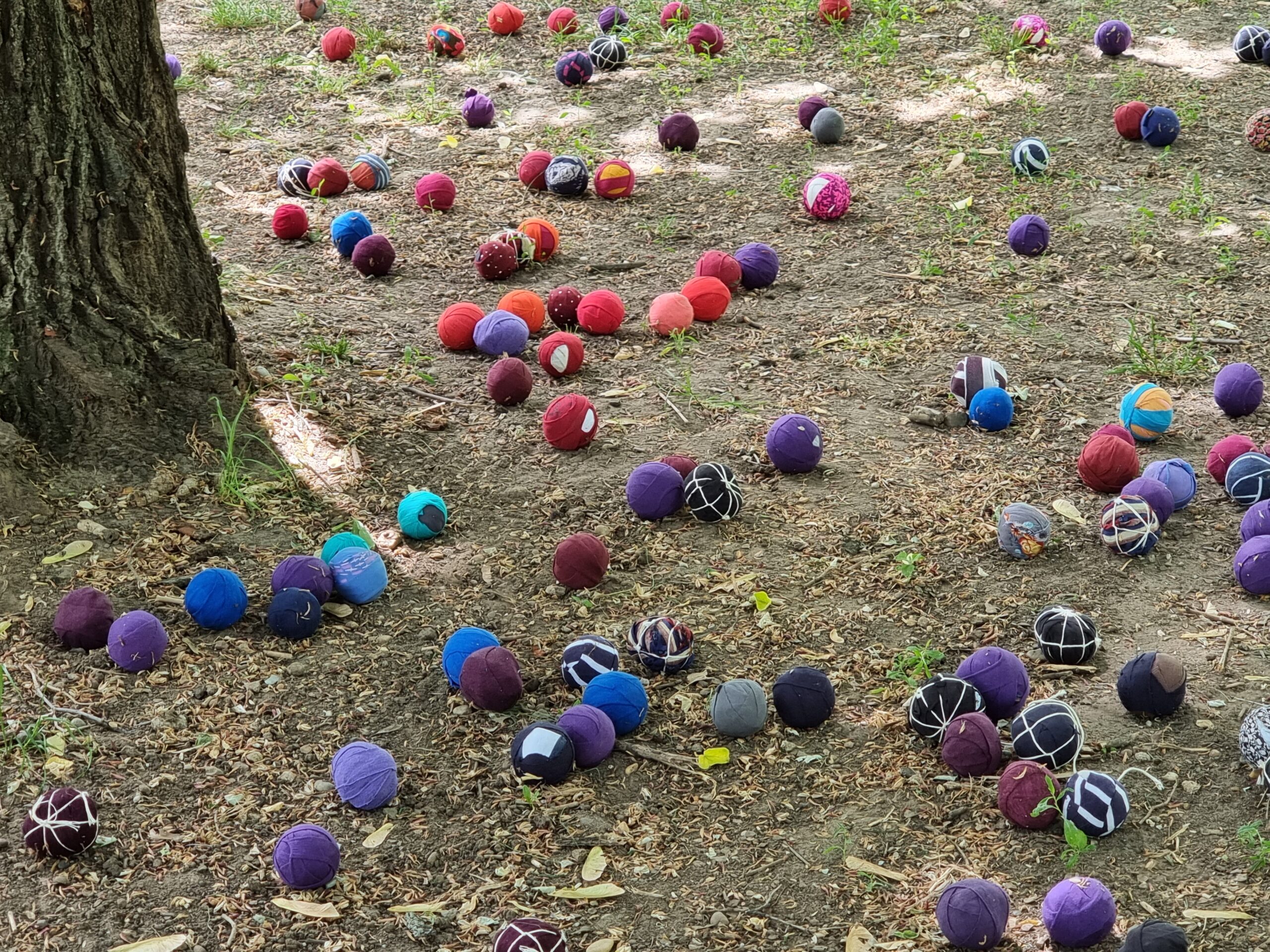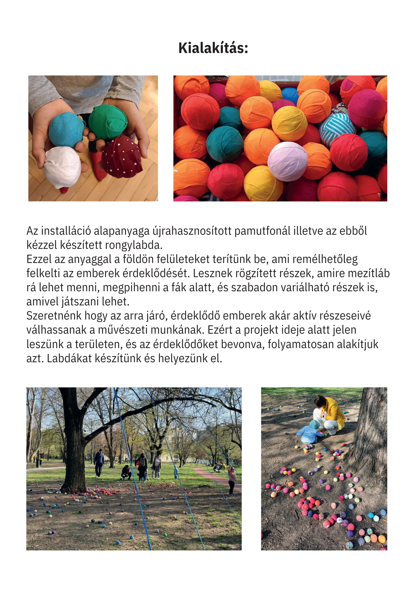 Az installáció anyaga újrahasznosított pamutból készült rongylabda, amiből több ezret használtunk fel. Jelen voltunk a helyszínen minden nap, és az arra járó érdeklődőket invitáltuk rongylabdák elkészítésére. Célzott gyerekcsoportoknak vizuális foglalkozásokat tartotunk, és nyilvános programokat szerveztünk a fák köré.