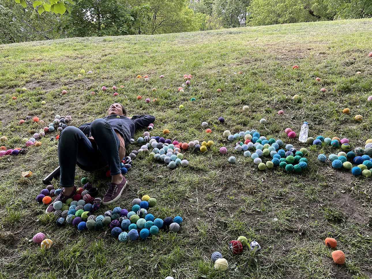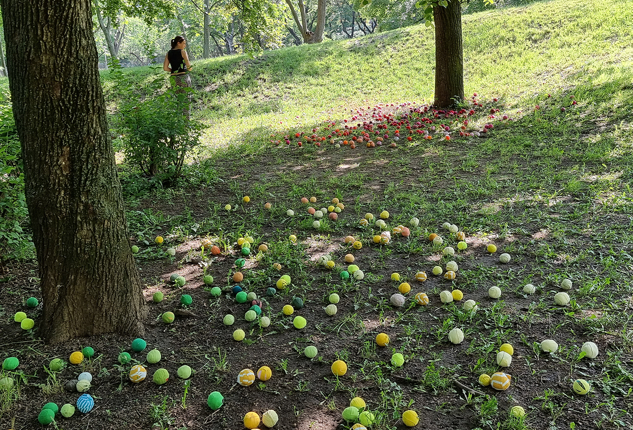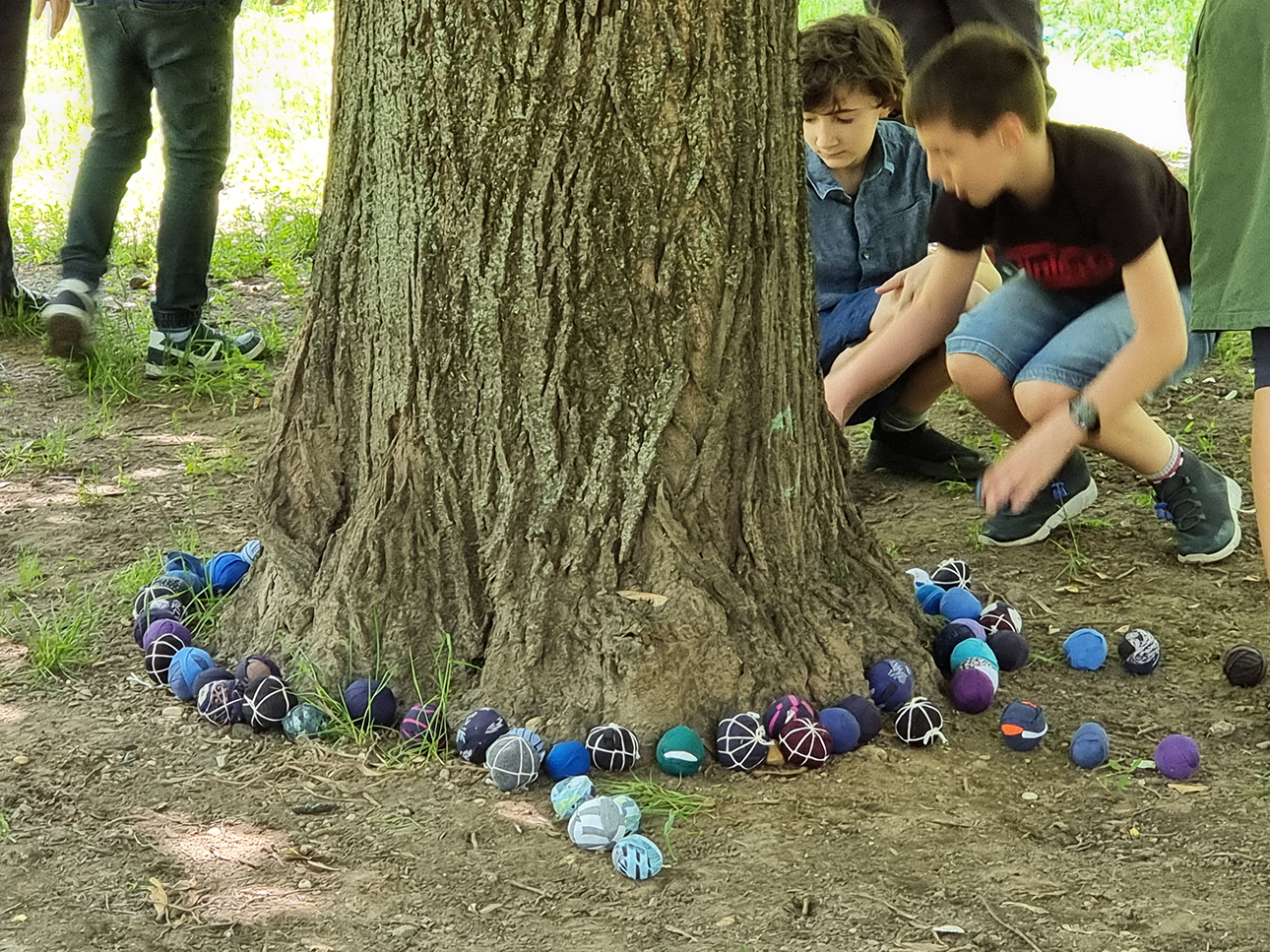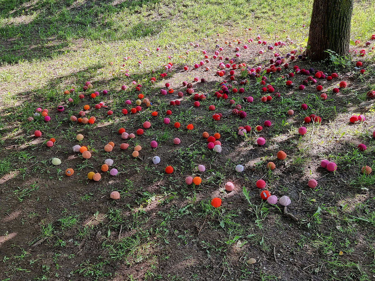 Az installáció anyaga újrahasznosított pamutból készült rongylabda, amiből több ezret használtunk fel. Jelen voltunk a helyszínen minden nap, és az arra járó érdeklődőket invitáltuk rongylabdák elkészítésére. Célzott gyerekcsoportoknak vizuális foglalkozásokat tartotunk, és nyilvános programokat szerveztünk a fák köré.