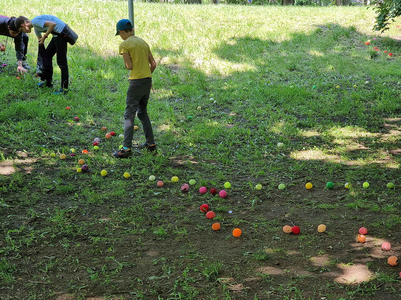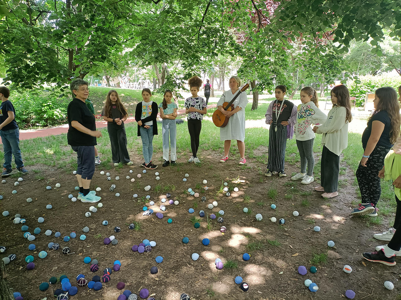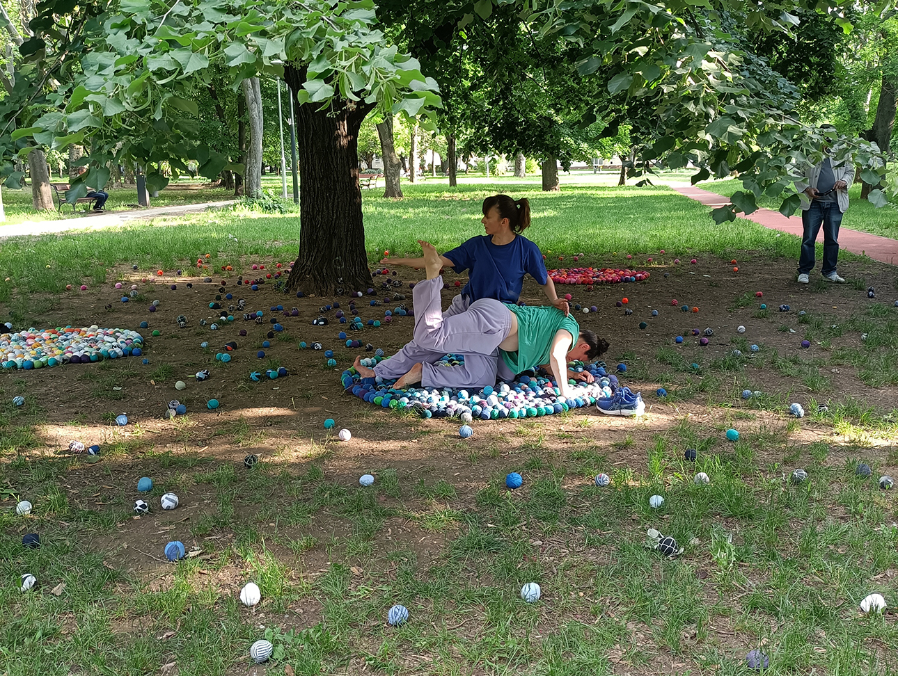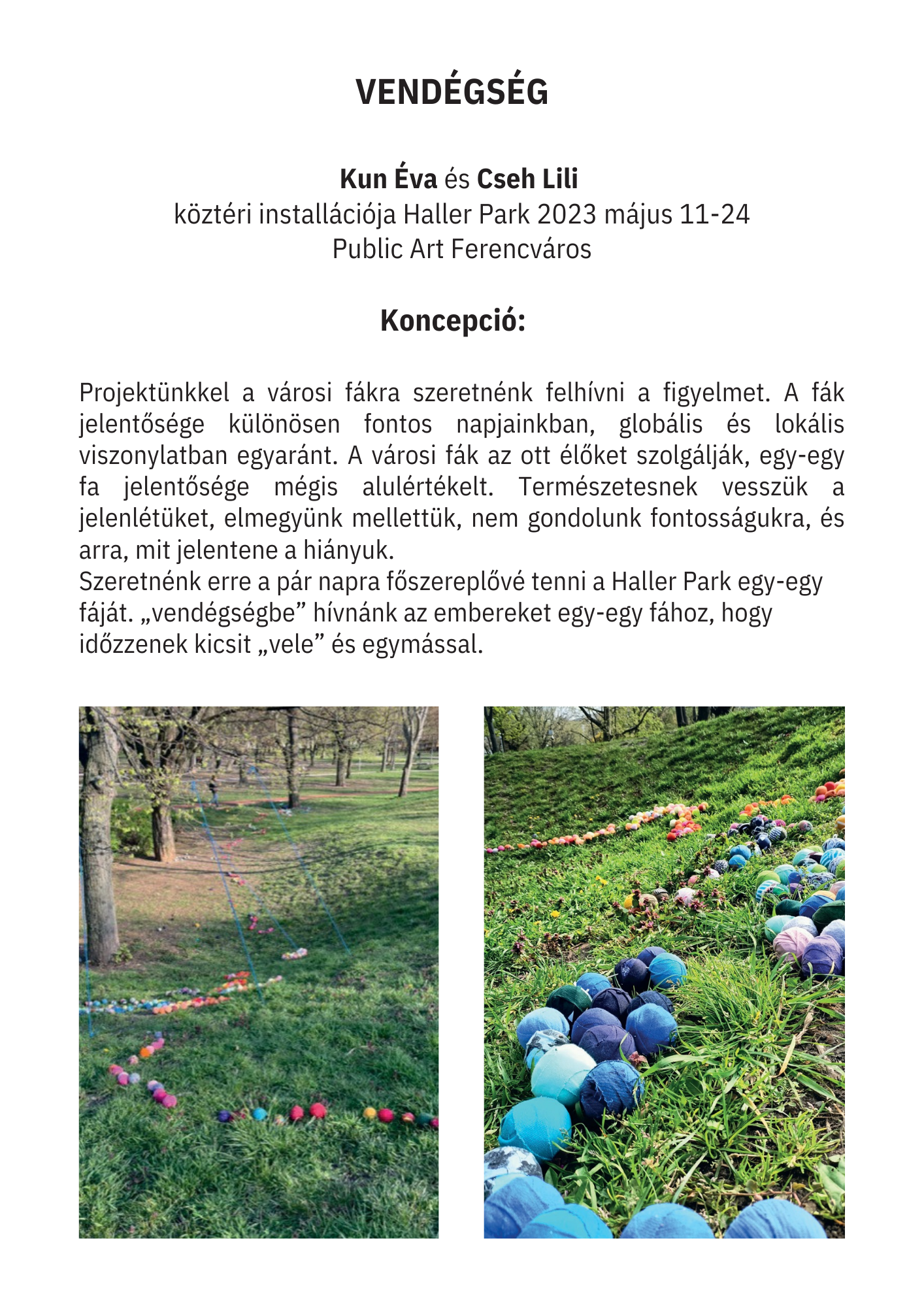 Az installáció anyaga újrahasznosított pamutból készült rongylabda, amiből több ezret használtunk fel. Jelen voltunk a helyszínen minden nap, és az arra járó érdeklődőket invitáltuk rongylabdák elkészítésére. Célzott gyerekcsoportoknak vizuális foglalkozásokat tartotunk, és nyilvános programokat szerveztünk a fák köré.